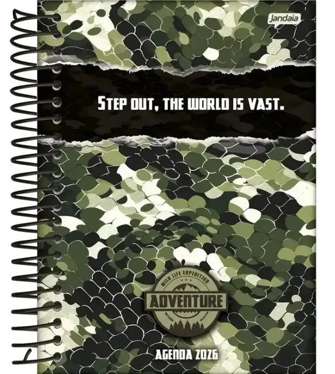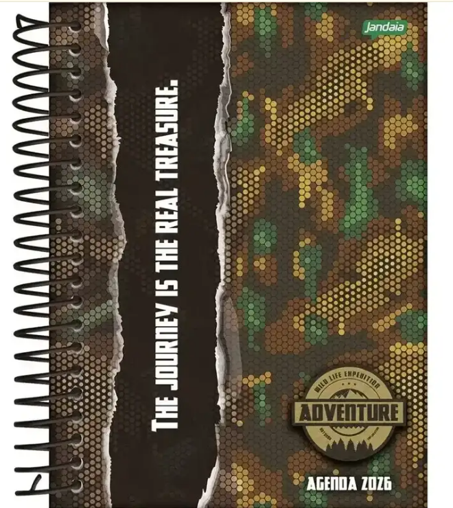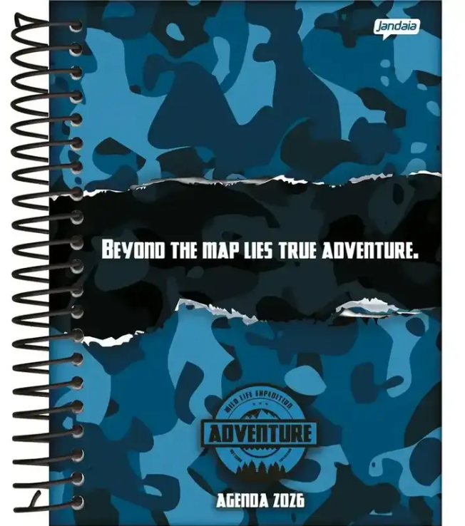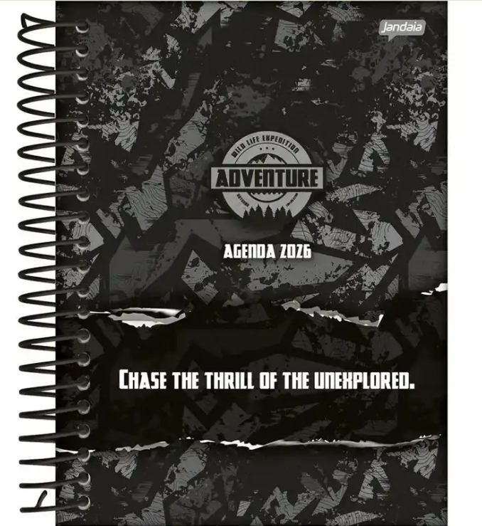 Agenda Diária Adventure 2026 da Jandaia, prática e resistente, com capa dura e encadernação em espiral. Possui 352 páginas e formato 133x178mm, ideal para organização diária. Perfeita para anotações, compromissos e uso pessoal ou escolar.