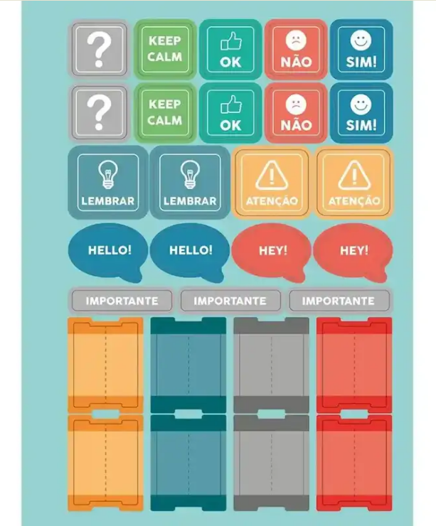 - Composição interna: bolso em papel, cartela de adesivos, miolo de 63g