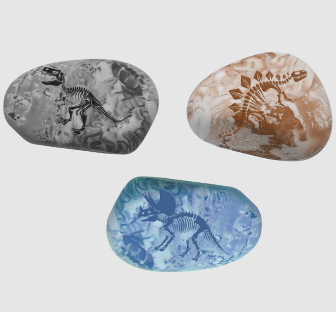 A borracha Fóssil é inspirada em pedras com fósseis de dinossauros. É atóxica livre de PVC e tem textura super macia!