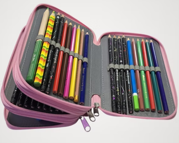 Estojo Enjoy com 6 divisões. Cabem 52 lápis, inclusive o lápis Jumbo, frente prateada e fofinha, suave ao toque.